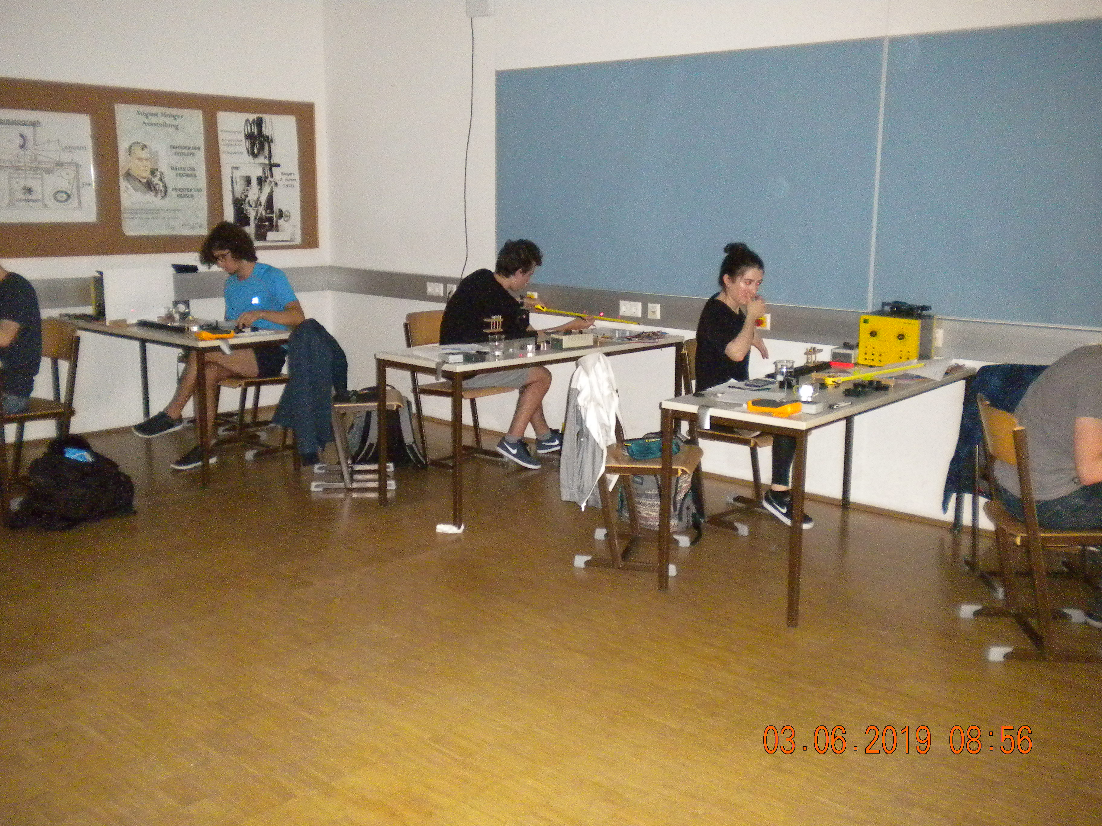 Am Montag, dem 3. Juni 2019 wurden die Schüler/innen in zwei Gruppen gesplittet. Eine Gruppe begann im Physik- und die andere Gruppe im Chemie-Saal mit dem experimentellen Wettbewerb. Beide Gruppen wurden zunächst mit je zwei experimentellen Aufgaben konfrontiert. Für deren Bearbeitung standen insgesamt 2 ½ (Uhr)-Stunden zur Verfügung.