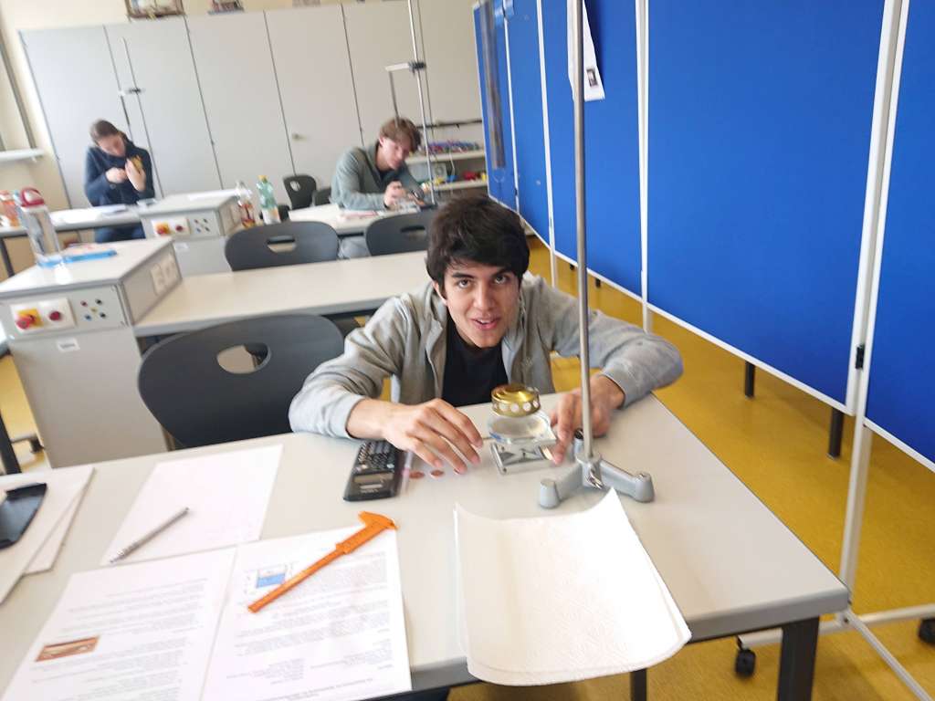 Schon am Montag, wenig gestärkt durch eine durchwachte Nacht, begann um 8:30 Uhr der Experimentierteil des Wettbewerbs. 3 Experimente zum Brechungsindex einer Kreisscheibe (Optik/modifiziertes IPHO-Experiment), zur Resonanzfrequenz eines Schwingkreises (Elektrizität und Magnetismus) und zur Oberflächenspannung von Wasser (Mechanik). In der kurzen Zeit (1,5h pro Experiment) aussagekräftige Werte zu messen und zu interpretieren, ist wie eine überhängende Steilwand zu erklimmen, um bei unserer Bergsteigeranalogie zu bleiben.