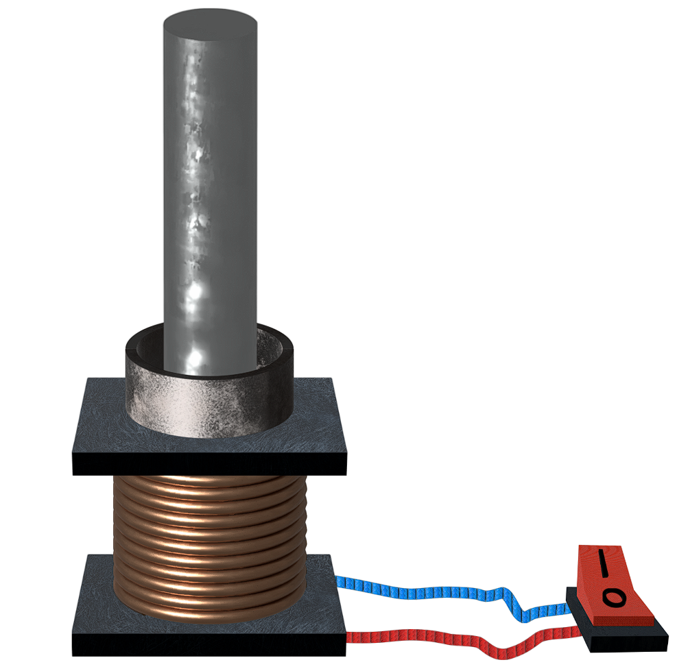 Eine Spule mit langem Eisenkern wird so aufgestellt, dass die Spulenachse vertikal steht. An der Spulenoberseite legt man einen geschlossenen Aluminiumring so auf den Eisenkern, dass er diesen nicht berührt.
