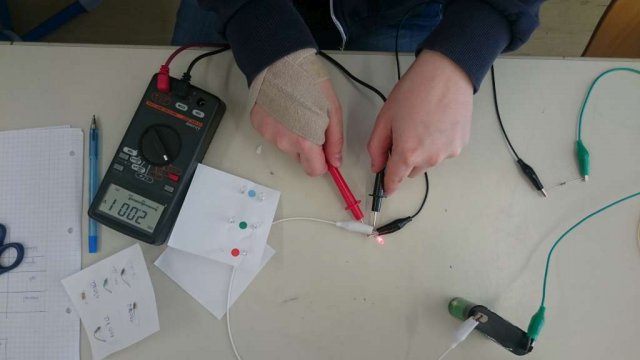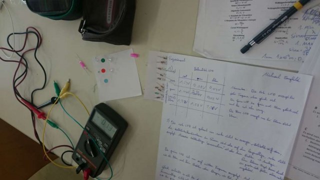 Im Experiment standen drei bunte LEDs in den Grundfarben rot, grün und blau im Vordergrund. Es war su untersuchen, wie die unterschiedlichen LEDs auf Einstrahlung mit farbigen Licht reagieren, sie wurden wie ein Fotovoltaikzelle als Stromquelle verwendet. Dabei war der optimale Arbeitspunkt der kleinen Solarzellen zu finden.